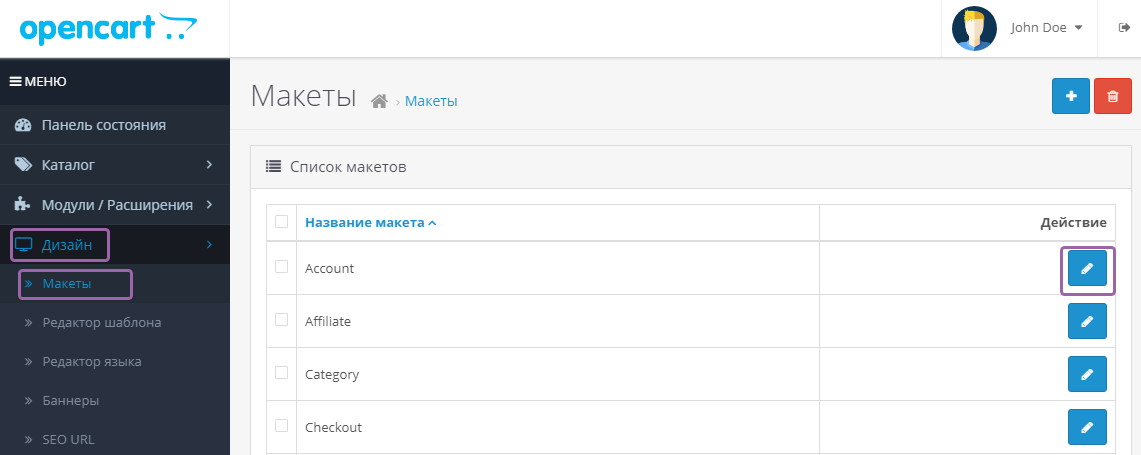 Если модуль активно использовался в работе сайта в первую очередь необходимо удалить его из макетов страниц, где он размещен. Для этого необходимо зайти в Раздел Дизайн – Макеты – выбрать страницу, на которой расположен данный модуль, нажать кнопку редактировать (синяя кнопка с карандашом).