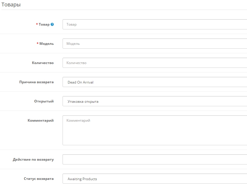 Статус возврата - необходимо выбрать статус из выпадающего списка.