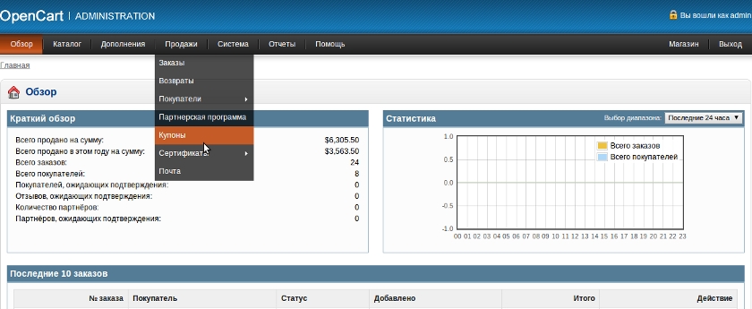 Войдя в систему Вы находитесь на странице «Главная», где представлен обзор покупок, статистика и последние 10 заказов. Чтобы перейти к настройке, выбираем в горизонтальном меню пункт «Продажи», из выпадающего списка выбираем пункт «Купоны» и нажимаем на него: